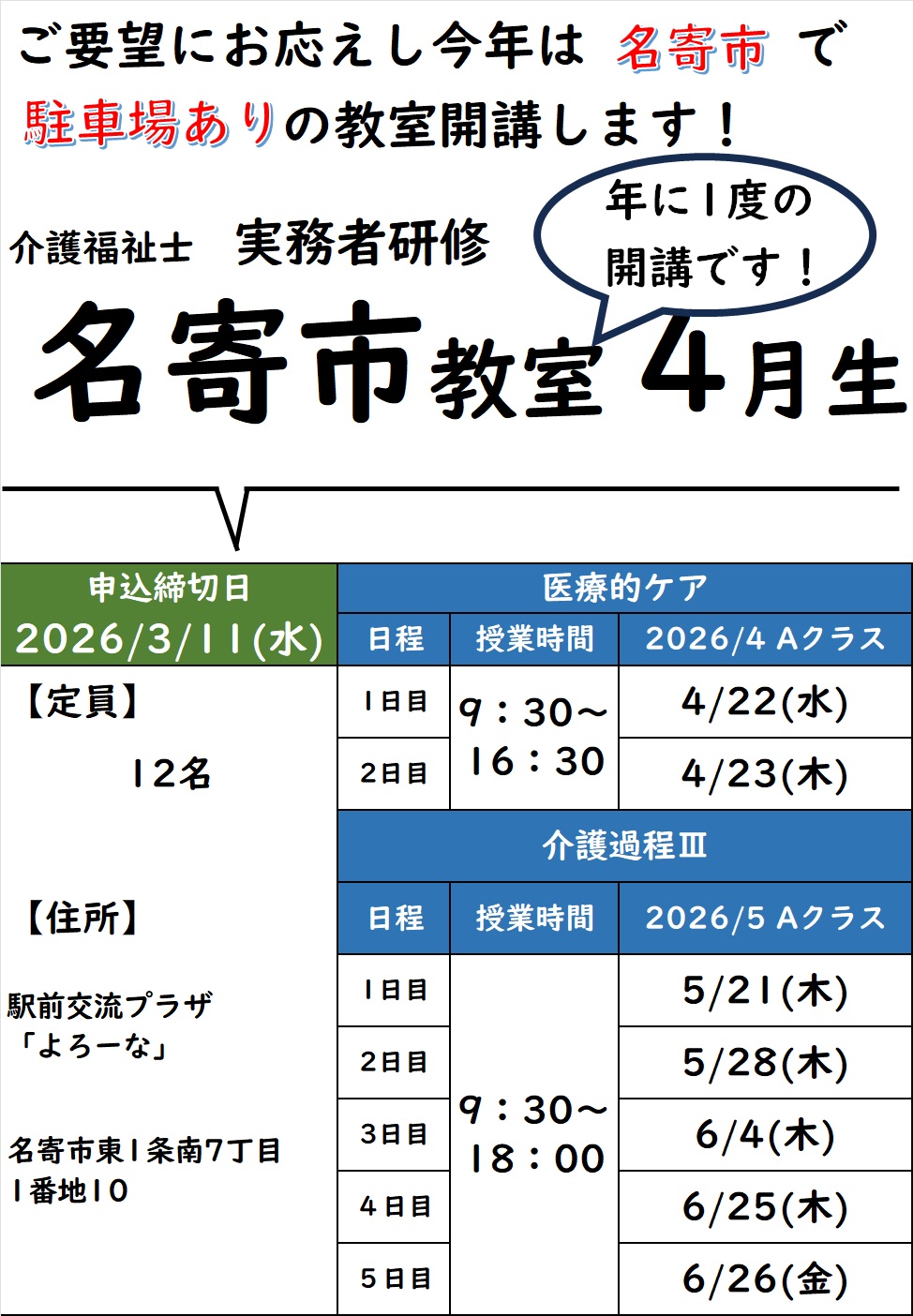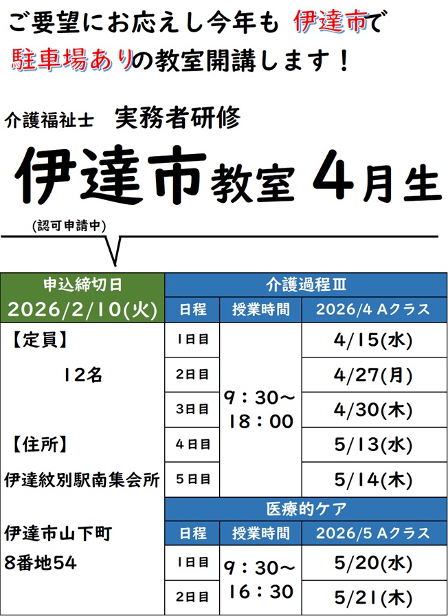 【★実務者研修 2026年春の通学日程ご案内★】名寄市4月生・別海町4月生・伊達市4月生 募集開始!