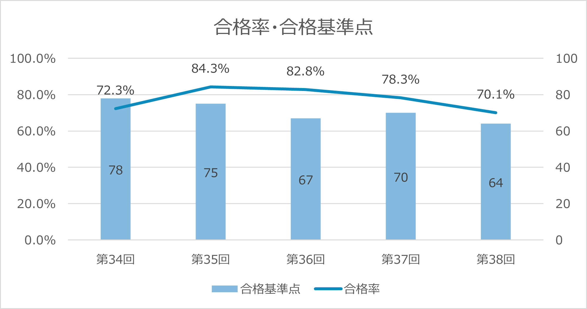 | 合格率 | 72.3% | 84.3% | 82.8% | 78.3% | 70.1% |